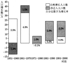 1、1951~2000年,该国 [? ] A、是人口净迁入国 B、人口迁入是维持人口增长的主要方式 C、人口的出生率一直高于死亡率 D、人口增长了15.1% 2、据图示资料推测,该国 [? ] A、自20世纪70年代,人口再生产进入现代型 B、可能位于欧洲 C、1990年人口达到900万 D、20世纪末青壮年人口比重偏大 参考答案:1、A 本题解析: 本题难度:一般 |