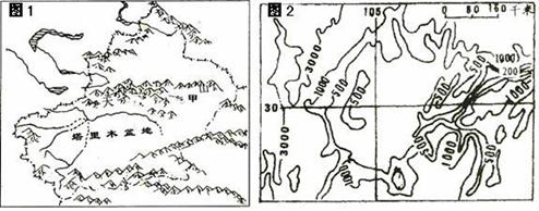 (3)图2盆地位于我国? ? ?自然区,属于?气候。该盆地四周被? ?和? ?环绕,地势特点是?。该盆地土地肥沃,物产丰富,素有“?天府之国?”美誉。 参考答案:(1)C ?B 本题解析:(1)根据轮廓分析甲是塔里木盆地。根据经纬度和等高线可知是四川盆地。(2)我国三大自然区,塔里木盆地位于西北干旱、半干旱区。气候是温带大陆性气候。根据气候光照充足、昼夜温差大等条件适合棉花的生长。(3)我国三大自然区,四川盆地是东部季风区。气候是亚热带季风气候,分析四川盆地的地形特征。 本题难度:一般 3、单选题 读图回答下列题目 |