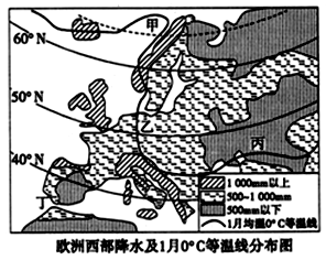 (2)读图,甲处沿岸有北大西洋暖流经过,导致等温线与海岸线平行,主要因素是洋流。乙处位于平原,等温线主要受海陆位置影响,或是西风影响。丙处等温线大致与纬线平行,说明主要受纬度位置的影响。或者说是太阳辐射的差异。