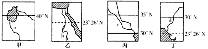 1、单选题 在年降水量不足250毫米、灌溉水源不足的地区,一般不能发展灌溉农业,下图中的甲、乙、丙、丁所示地区都是灌溉农业区。读图回答1—4题。