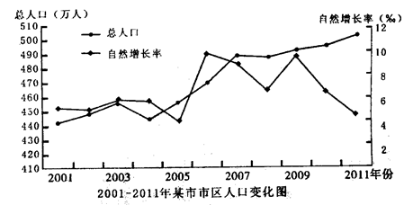 小题1:2009年至今,该市市区人口自然增长率下降但是总人口却增加的主要原因是(?)
