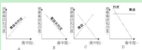 2、单选题  当地时间2010年2月27日智利发生8.8级地震,下图中能正确反映这次地震的震中距、震级和烈度关系是