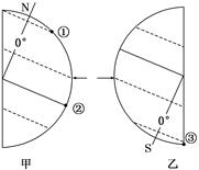 (1)从甲图中可知北极圈内出现极昼,故太阳直射北回归线;从乙图中可知南极圈内出现极昼,故太阳直射南回归线。