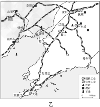 (1)图中的甲地为鞍山钢铁公司,乙地为宝山钢铁公司。其钢铁工业基本形成一定的工业地域。这种工业集聚带来的好处以及弊端可能有哪些?(4分,答出四点即可)