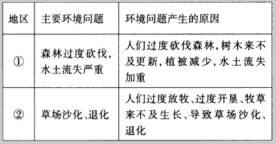 (3)图乙中①地和②地的主要环境问题是什么?简要分析造成两地环境问题的主要原因,填写下表。
