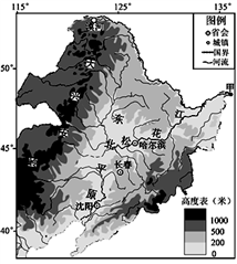 小题2:东北平原位于大、小兴安岭和长白山地之间,大部分海拔在200米以下。长春附近松辽分水岭处地势稍高,所以A正确;有大陆性和季风型气候特征。夏季短促而温暖多雨;冬季漫长而寒冷少雪,所以B错。主要农作物为小麦、大豆、玉米、水稻等粮食作物,是旱地农业为主,所以C错;河流以雨水补给为主,所以D错。