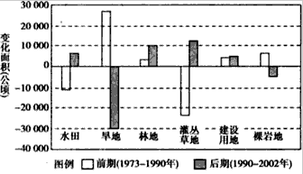 3、单选题 下图为我国西南地区某流域1973~2002年部分土地利用类型面积变化图,读图回答1—2题。