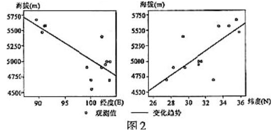 5、单选题 图2示意长江上游地区雪线高度的经向和纬向变化趋势。完成下题。