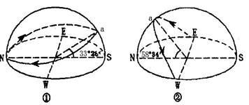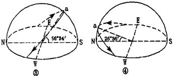 5、综合题 材料一:某日①、②、③、④四地太阳视运动示意图(E、S、W、N分别表示东、南、西、北四个方位,底圆表示观测者所在的地平圈,带箭头的圆弧表示一天中太阳在天空中的运动轨迹,图中角度为当地某一时刻的太阳高度)(10分)