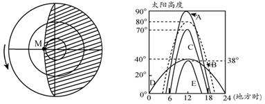 (3)图中M点的地理坐标,经度: ,纬度: 。(2分) (4)A~E五个地点中,自转线速度最小的是 。若流经五地的河流,两岸岩性相同,则适合在河流右岸建设港口的地点是 。(2分) (5)此时,与北京处于同一日期的经度范围是 。(1分) (6)在右图中,画出这一天南极点的太阳高度日变化线。(1分)