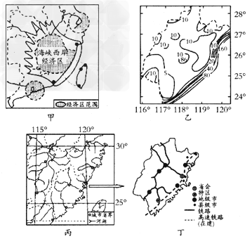 下图分别为海峡西岸经济区示意图(甲),福建省全年大风天数分布示意图(乙),某区域图(丙),福建省城市、交通线的分布图(丁)。?