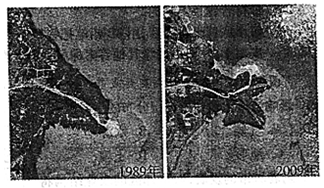 1、单选题 图为我国北方某河流入海口1989年和2009年的卫星形象。该河口区河流主流曾于1996年人工改道。读图回答小题。