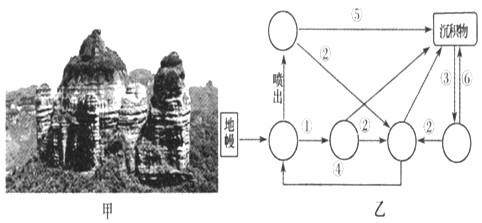 1、单选题 2010年8月,“中国丹霞”被正式列入《世界遗产名录》。图甲为广东丹霞山地貌景观,图乙为地质循环示意图。图示山体主要是红色砂砾岩,看去似赤城层层、云霞片片,古人取其“色如渥丹、灿若明霞”之意,称为丹霞山。读图回答1~2题。