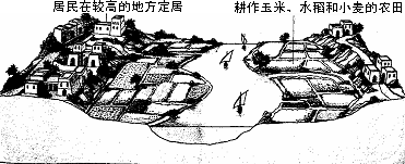 本题解析: 小题1:从图中可以看出,河流沿岸的河谷平原为农田,种植小麦、玉米、水稻等作物,而河流沿岸地势较高的地方为人类的聚落分布地,该地居民建筑样式为平顶,从而可以推测该地区降水较少,可以判断该区域最有可能是热带沙漠气候。 小题2:河流沿岸的土地利用方式分布的差异主要受河流径流量的季节变化大的影响,洪水季节泥沙淤积,形成肥沃的土壤利于人类的耕作,地势较高的地方可以避免洪水灾害,同时又临近水源,利于人类的居住。