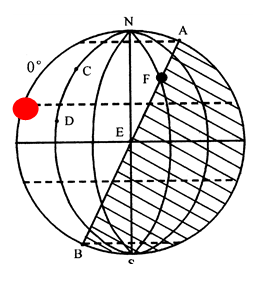 (1)阴影部分表示黑夜,非阴影表示白天,在图上标出太阳直射点。