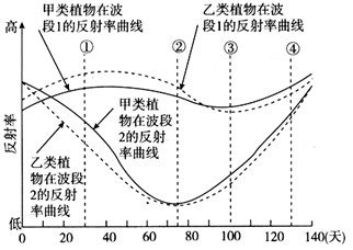 2、单选题 不同地物在同一光谱波段上的反射率差异越大,越容易区分。下图反映了甲、乙两类植物在生长期内两个波段上的反射率。在遥感影像上区分这两类植物,应该选择生长期内哪一天的影像最合适