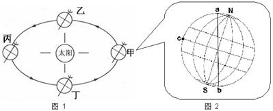 5、综合题 (12分)读二分二至日地球公转位置示意图(图1)和地球位于甲位置时昼夜状况图(图2),完成下列问题。
