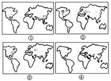 2、单选题 下列四幅图分别表示四种地理事物的集中分布地区。表达正确的是