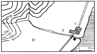 3、综合题 下图表示我国30°N附近的大陆东部某地A、B、C、D四区域农业生产的布局,从以下备选答案中选出你认为合适的农业项目,并说明理由。(20分)