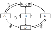 【小题1】各类岩石都可以经过高温熔化作用形成岩浆,所以据箭头三进一出的为岩浆的位置即D为岩浆,则C为岩浆岩,有风化物经外力形成的为沉积岩即A为沉积岩,B为变质岩。所以外力作用为.③C正确。