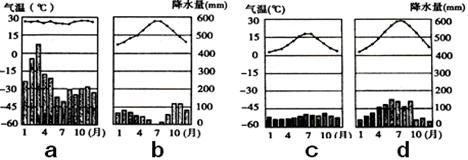 (2)常年受甲气压带控制地区的气候特征是?,其气候类型对应为上右图中 ?地(填①、②、③、④),其气候特征可用下图中?(填a、b、c、d)图表示。(3分)