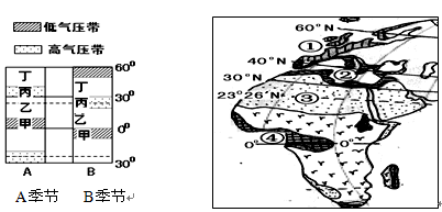 ?。(1分) A季节为北半球的?(季节),就全球而言,气压带风带位置大致偏?。在上图B季节中分乙地风带为?,丁地风带为?。(5分)