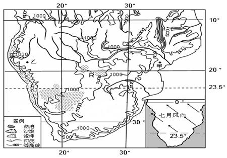 本题解析:(1)结合纬度位置和海陆分布判断,甲处为热带草原气候,而乙处为热带沙漠气候,其原因可从海陆位置、大气环流和洋流等方面分析。(2)地形特征应描述主要的地形类型和地势分布特征,注意结合图示的等高线分布信息。(3)沼泽的形成主要受地形、气候、冻土等因素的影响,结合还地区的热带草原气候的降水量的季节变化可判断。