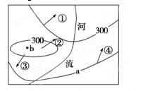 【小题2】根据河流与等高线的关系可知,河流向东北流,再根据潜水位与地形的关系可知,西南的等潜水位线数值大,东北数值小,潜水由高处垂直于潜水面流向低处,用作图法可得出,河流左岸潜水补给河流水,右岸河流水补给潜水,D对。