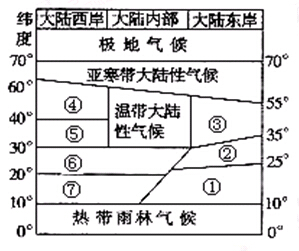 【小题2】⑦气候类型位于大陆西岸,在北纬10°-20°之间,为热带草原气候,夏季受赤道低气压带影响高温多雨,冬季受信风带影响少雨,故选B正确。