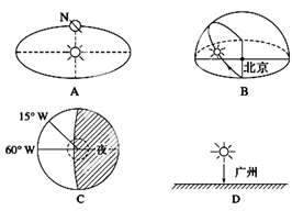 4、单选题 下列为地球位置或太阳光照示意图,其中与3月19日这一天的示意图最接近的是( )