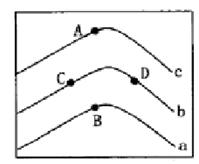 【小题2】等高线符合“凸高为低”,瀑布形成于河流流经陡崖处,河流分布于山谷处;甲在陡崖处,但在山脊线上;丙在山脊上;丁在平原地区;乙在陡崖处,山谷线上。最易形成瀑布的是乙。选C正确。