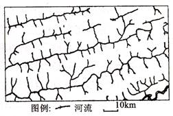 两河流的分水岭是山脉;图上没有注出河流的走向和海拔,所以不能确定河流的流向和地势是否低平。褶皱构造中才有可能发育此地貌。