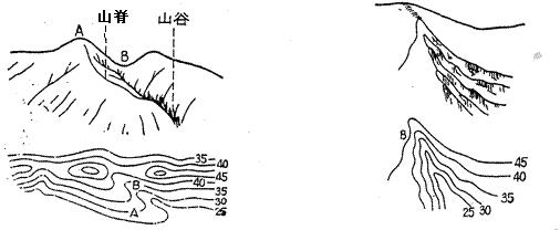 小题1:山脊和山谷:如图所示,山谷和山脊几乎具有同样的等高线形态,因而要从等高线的高程来区分,表示山脊的等高线是凸向山脊的低处,如图中A处.表示山谷的等高线则凸向谷底的高处,如图中B处。因此,由题图,可以判断出①是鞍部、②是山坡、③是山脊、④是山脊、⑤是山谷,选项D正确。