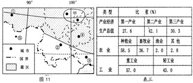 4、综合题 霜是指贴近地面的空气温度降低到0℃以下,空气中水汽凝华而形成的一种大气现象。结合下图“某地某年1月1日无霜区的分布图”(图11)和表三“图中甲区域经?济结构”,回答下列各题。