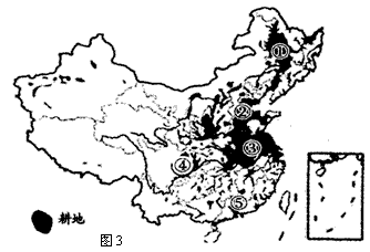 (4)图3为“我国耕地集中分布区图”,图中①、②、③、④、⑤平原中人均耕地最多的是______(写
