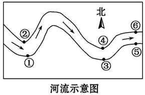 2、单选题 下图标注的北半球某河流两岸六地中,在自然状态下侵蚀较重的是