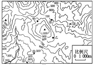 【小题1】图示区域明显标出的山峰有两座。站在①地只能看到一山峰座,且此山峰离①地距离远远超过2 km,A选项不对;站在③地看到正前方一座山峰时,左侧没有山峰,况且③地和图示区域中心位置的山峰之间还有一条封闭的等高线,若这条等高线海拔800米,说明其围成的区域是一个小山丘,会挡住视线,导致③地看不到山峰,排除C选项;同理,站在④地看山峰不能满足题干提到的“正前方和左侧各有一座山峰,其中一座山峰目测距离约2km”条件,排除D选项;站在②地看图示区域中心位置的山峰时,左侧有一座山峰,根据比例尺计算,中心位置的山峰离②地距离约2km,符合题干条件,B选项正确。