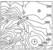 小题1:根据图示的等高线分布判断,AB处等高线“凸低为高”,为山脊,A错误;CD处等高线“凸高为低”为山谷;B错误;F处地形四周低,中间高,但山顶附近等高线向内凹,故判断为火山口,C正确。