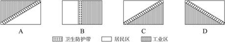 本题解析:华北地区位于我国东部季风区,冬季吹西北风,夏季吹东南风,所以工业区应建在垂直于主导风向的方向上,即东北或西南。工业区与居民区之间有卫生防护带隔开,所以正确答案为D项。?