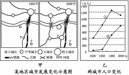 (3)图乙的①②两线中,反映G城人口变化特点的是点是________________线。这说明20世纪80年代以来,G城人口变化的特点是____________,其原因是存在________、________等社会经济问题。(8分)
