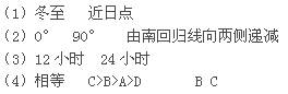 (4)ABCD四点中,自转角速度?,自转线速度?,有阳光直射现象的有?。