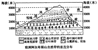 A.江南丘陵——下垫面热量充足 B.青藏高原——距下垫面热源近 C.东北山地——迎风坡降水丰富 D.西北山地——降水少光照充足 参考答案: 本题解析:本题考查资料分析运用能力(林线)。 本题难度:一般 4、单选题 ? 下图为冬奥会所在地阿尔卑斯山山地自然带垂直分布示意图,影响图中阿尔卑斯山南、北坡雪线高度不同的主要因素是 参考答案:B 本题解析: 本题难度:一般 5、综合题 读亚欧大陆部分自然带分布模式图,读后完成下列要求。(16分) 参考答案:(1)亚热带常绿硬叶林带?温带落叶阔叶林带?亚寒带针叶林带?温带荒漠带(4分,每空1分) 本题解析:略 本题难度:简单 |
