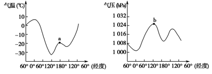 3、填空题 下图为沿北纬60°线所作的某月平均气温和气压水平分布变化示意图,读图完成下列各题。(10分)