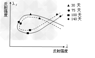 4、单选题 判读卫星遥感图像时常使用对比分析法,具体说就是对不同时间、不同地面物体的卫星图像进行对比和分析。如图 ,虚实两线分别代表玉米和大豆两种农作物在不同时间对两种不同电磁波的反射强度(图中符号分别代表播种30 、75 、100 、140 天后两种农作物反射的电磁波强度)。读图回答1-3 题。