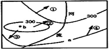 【小题1】河流经过的区域一定为山谷,根据“河流流向与等高线的凸向相反”可以判断出河流的流向;又河流集水方向应与等高线垂直,由高处流向低处,据图可知:只有①箭头正确,所以本题A正确。
