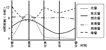 5、单选题 下图是300N地区几种朝向的窗户内每天可能受到太阳直接照射的时间曲线图。回答下列小题。