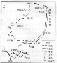 1、综合题 (10分)随着人们出游率的增高,“华山天下险”逐渐被“华山天下堵”所替代,如何认识与解决华山旅游拥堵问题引人关注。下图为华山东、西进山线路示意图,读图完成下列问题。