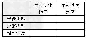 (3)填表比较该省甲河以南和以北地区自然条件与农业生产的差异。