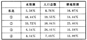 4、单选题 ? 读我国东北、华北、西北、东南、西南五个地区水资源、人口总数、耕地资源占全国比例比较表,回答1—2题。