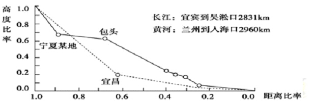 4、单选题 下图是“长江(宜宾—吴淞口)、黄河(兰州—入海口)河段的纵剖面示意图”,图中高度比率是指河流落差与总落差之比;距离比率是指河段长度与总长度之比。读图,完成下列各题。